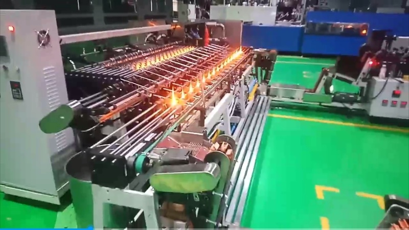 臥式安瓿瓶生產線包括成型機(玻管暫存—玻管提升—頸部預熱—頸部壓制—絲、泡部加熱—拉伸—口部火焰切斷)—連接(自動排序)—底切機(打點刻痕—口精切—擴口—底分離、制底—退火爐(產品退火—降溫冷卻)—自動檢測—裝盒(自動裝盒),可生產1ml,2ml,3ml,5ml,10ml,20ml不同直徑的安瓿瓶。